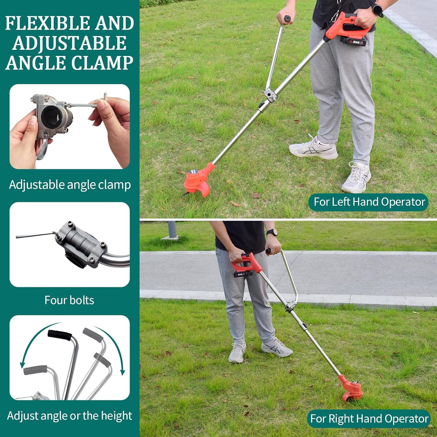 You can easily customize the 360° angle and height of the weed eater handle to find the optimal position to fit your comfort. Both left-handed and right-handed people can easy to control, reduces strain on your arms and back while enhancing control and maneuverability, ensuring a more enjoyable and efficient experience when using the weed eater.